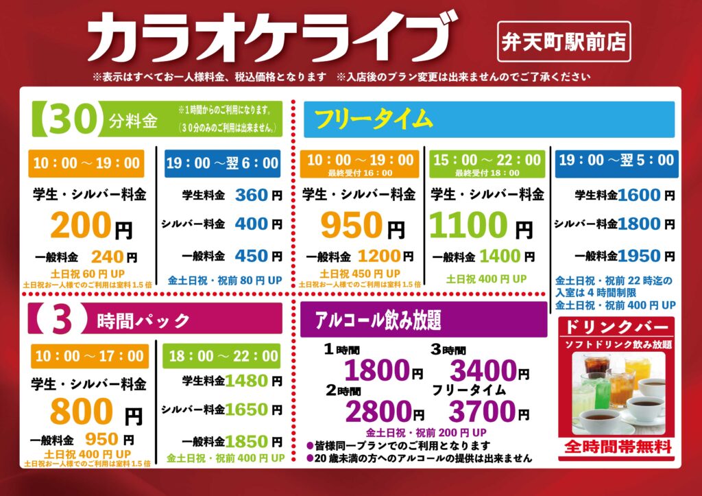 基本の30分料金だけでなく、3時間パック、4種類のフリータイムなどがございます。すべてドリンクバー付き、表記は安心の税込料金です。