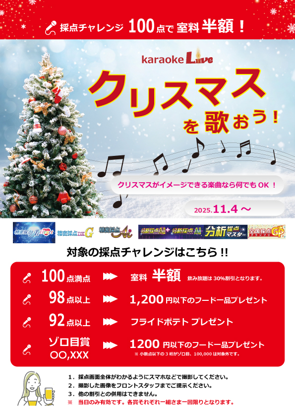 11/4~店舗限定先行開催!!今年もクリスマス採点チャレンジを開催いたします。(弁天町駅前店・北千里店・千林店・摂津店)にて先行開催!クリスマスがイメージできる曲ならどんな曲でもOK!上記採点チャレンジで獲得した点数に応じてプレゼントいたします。お手数ですが、画面を撮影してスタッフまでご提示ください。皆様のチャレンジお待ちしております!!