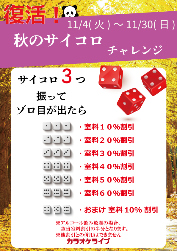 惜しまれつつも終了したサイコロチャレンジが期間限定で復活!!11/4(火)~11/30(日)で開催いたします。サイコロマシンでサイコロを3つ振って頂き、ゾロ目が出れば割引サービス!今回は456が出てもおまけサービス!皆様のチャレンジお待ちしております!!※サイコロチャレンジ終了店舗で実施致します。※一部、実施していない店舗がございます。店頭にてご確認ください。