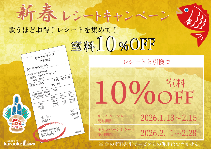 1/13~2/15の期間にご利用いただいたレシートを、2/1~2/28の期間にお持ち頂けましたら室料10%割引させていただきます!もちろんご使用頂いた日のレシートもお使いいただけます!!是非ご来店くださいませ🎵