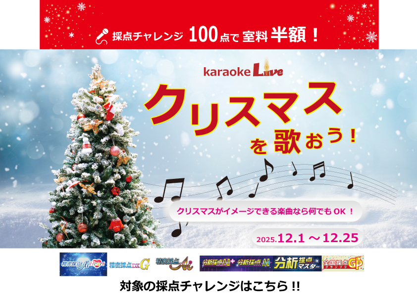 クリスマスがイメージできる曲ならどんな曲でもOK!上記採点チャレンジで獲得した点数に応じてプレゼントいたします。お手数ですが、画面を撮影してスタッフまでご提示ください。皆様のチャレンジお待ちしております!!