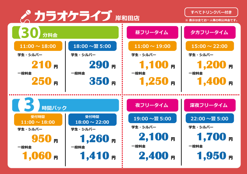 詳しくはこちらをご覧ください。⇒『カラオケライブ 岸和田店料金』