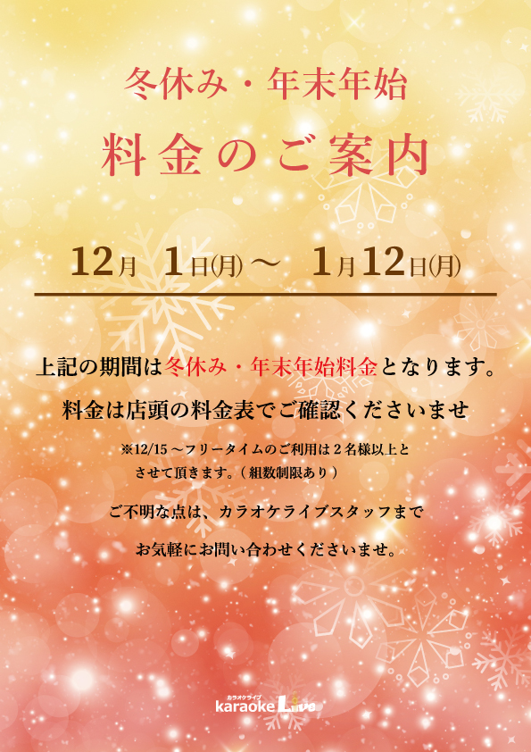 12/15よりご予約・フリータイムのご利用は2名様以上とさせていただきます。