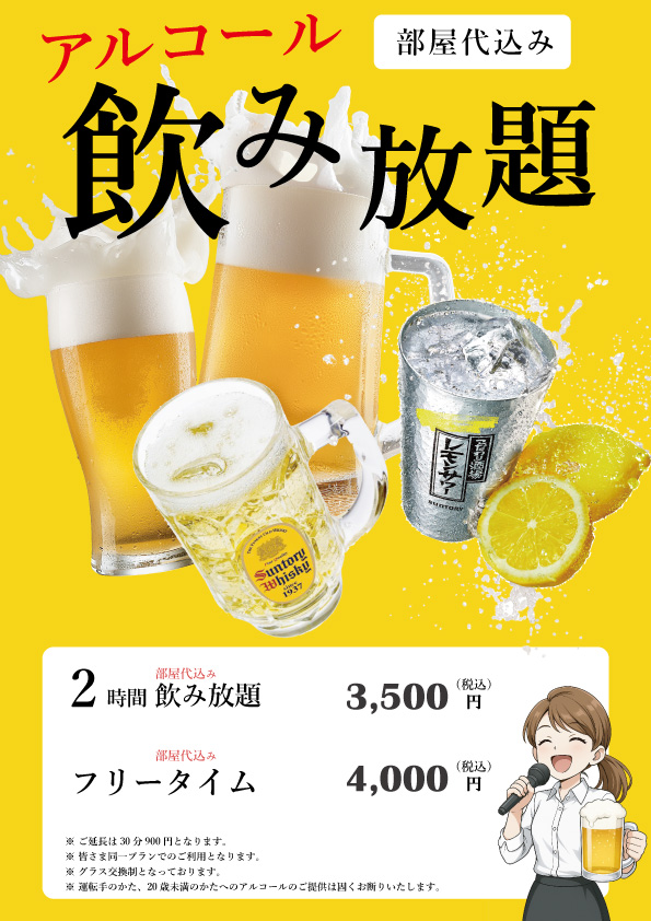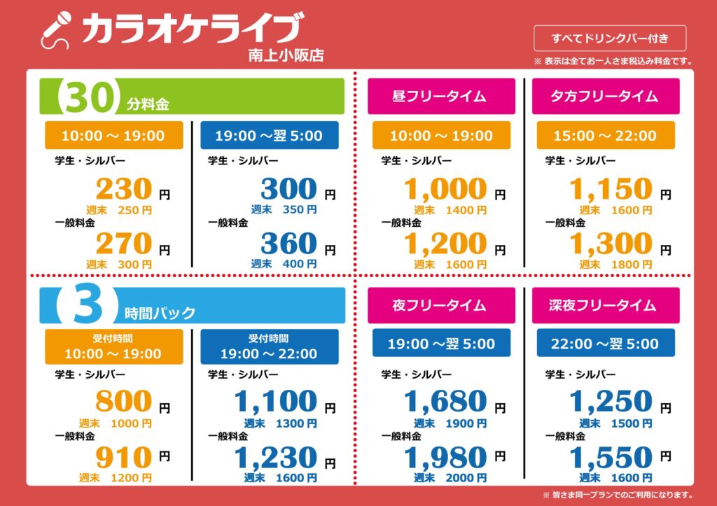 基本の30分料金だけでなく、3時間パック、4種類のフリータイムなどがございます。すべてドリンクバー付き、表記は安心の税込料金です。