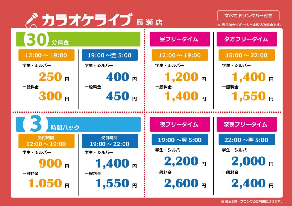 基本の30分料金だけでなく、3時間パック、4種類のフリータイムなどがございます。すべてドリンクバー付き、表記は安心の税込料金です。