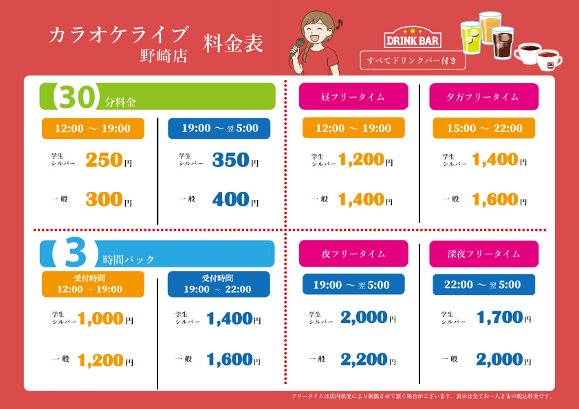 基本の30分料金だけでなく、3時間パック、4種類のフリータイムなどがございます。すべてドリンクバー付き、表記は安心の税込料金です。