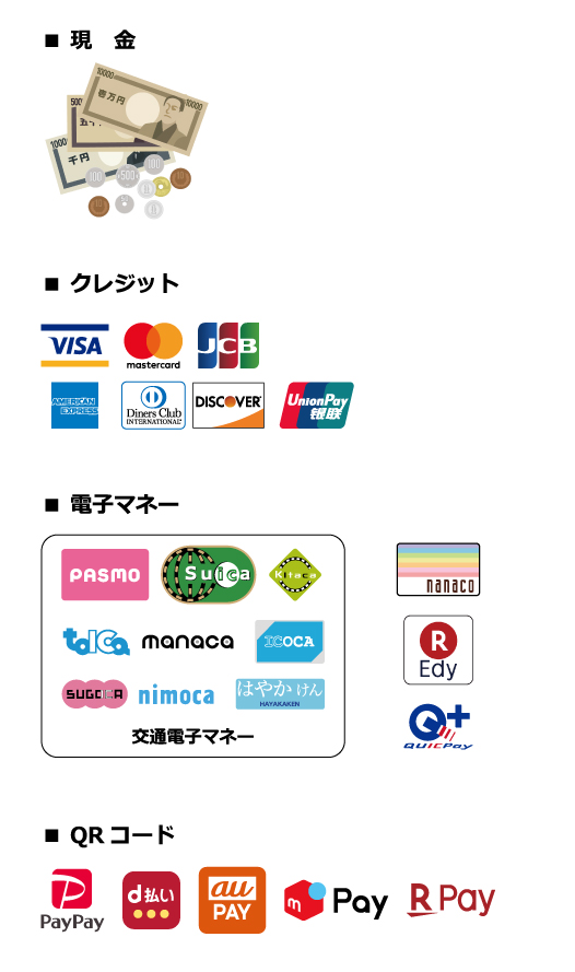 現金だけでなく、幅広いキャッシュレス決済方法を提供しています。