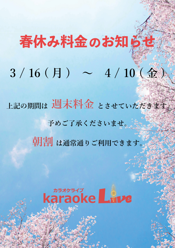 上記期間は春休み料金とさせていただきます。